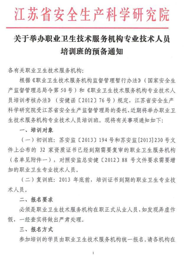 關于舉辦職業衛生技術服務機構專業技術人員培訓班的預備通知